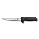 Victorinox Fibrox boning knife with a wide, 15 cm long blade, black non-slip ergonomic plastic handle, safe finger guard.