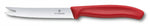 Victorinox Cheese and Sausage Knife with fork tip, serrated edge and red handle.