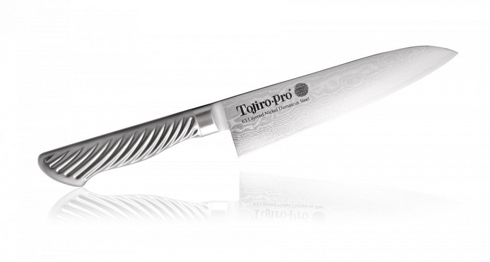 Tojiro Pro Nickel Damascus Chef's Knife with 18 cm long Damascus steel blade and stainless steel handle.